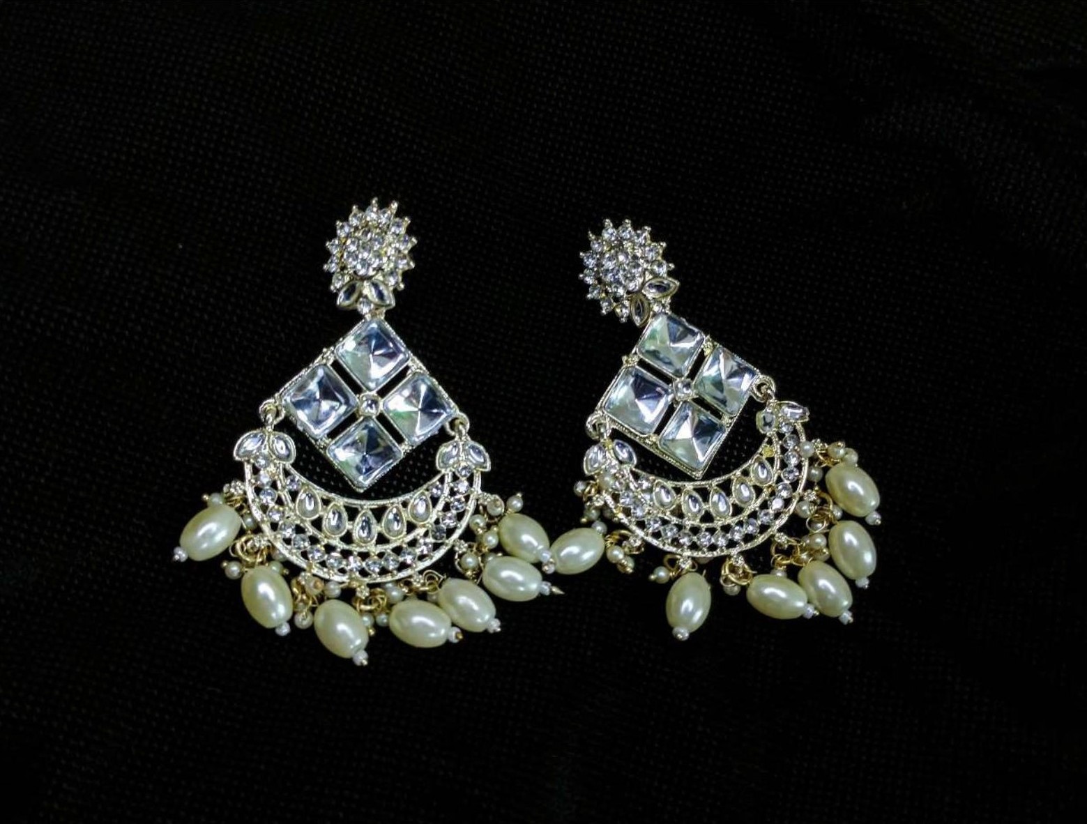 White Stone and Pearl Earrings – Brass and Alloy Steel